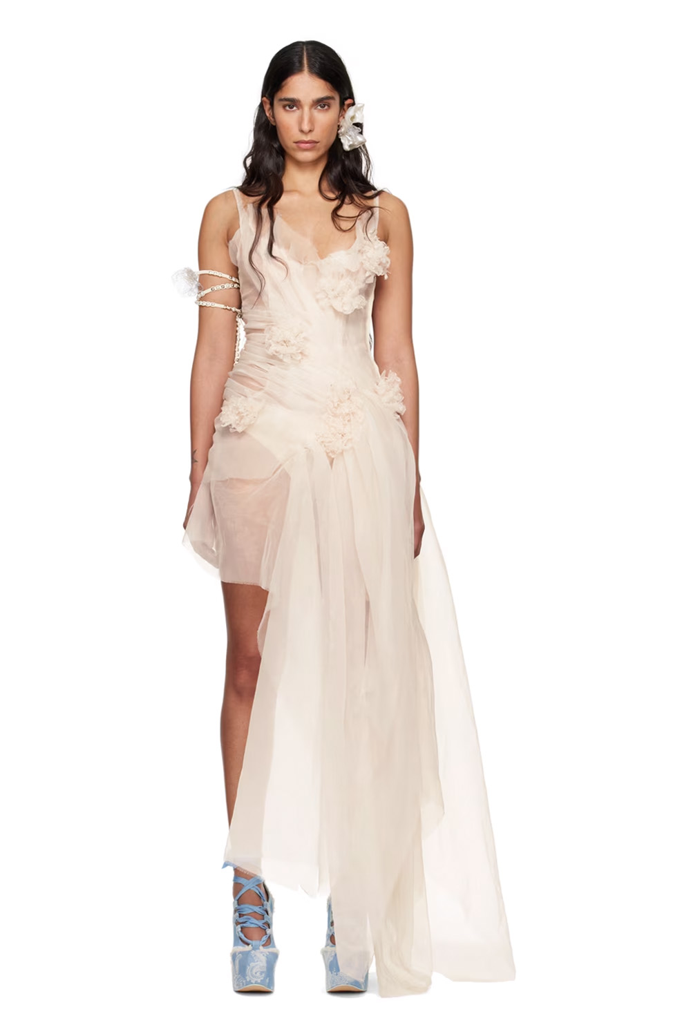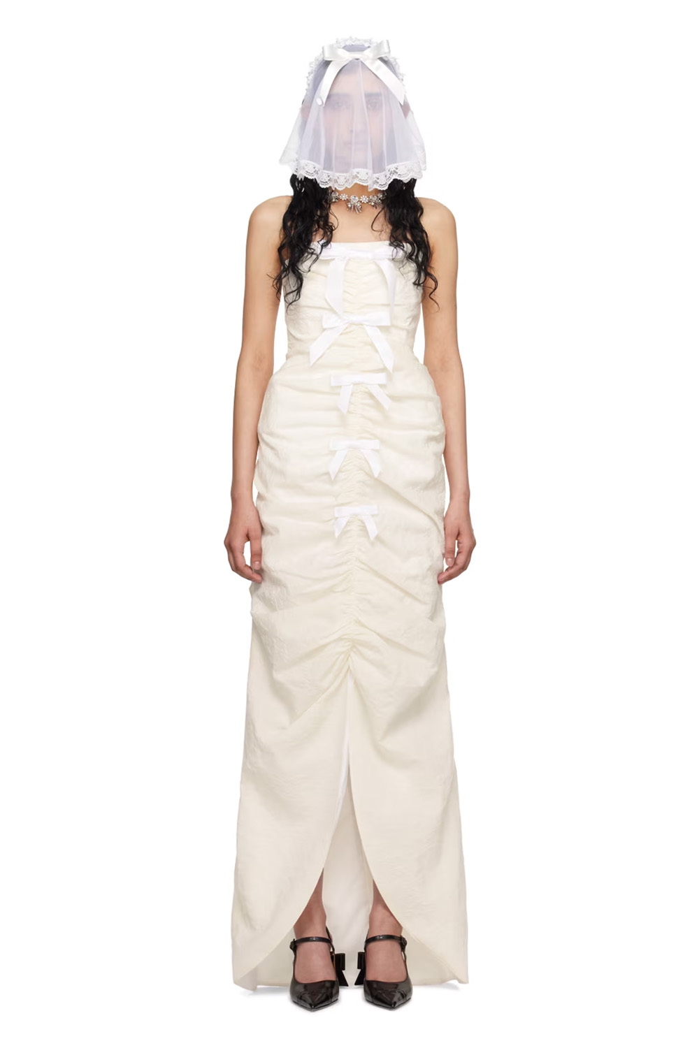 Also part of the SSENSE Bridal capsule, Shanhai-based label Shushu/Tong‘s Off-White Ruched Maxi Dress features an unconventional blend of wool and nylon fabric, with ruching and floral patterns throughout. Supportive boning at the chest provides structure while satin bow appliqués at the front add a sweet detail to the otherwise minimal gown.