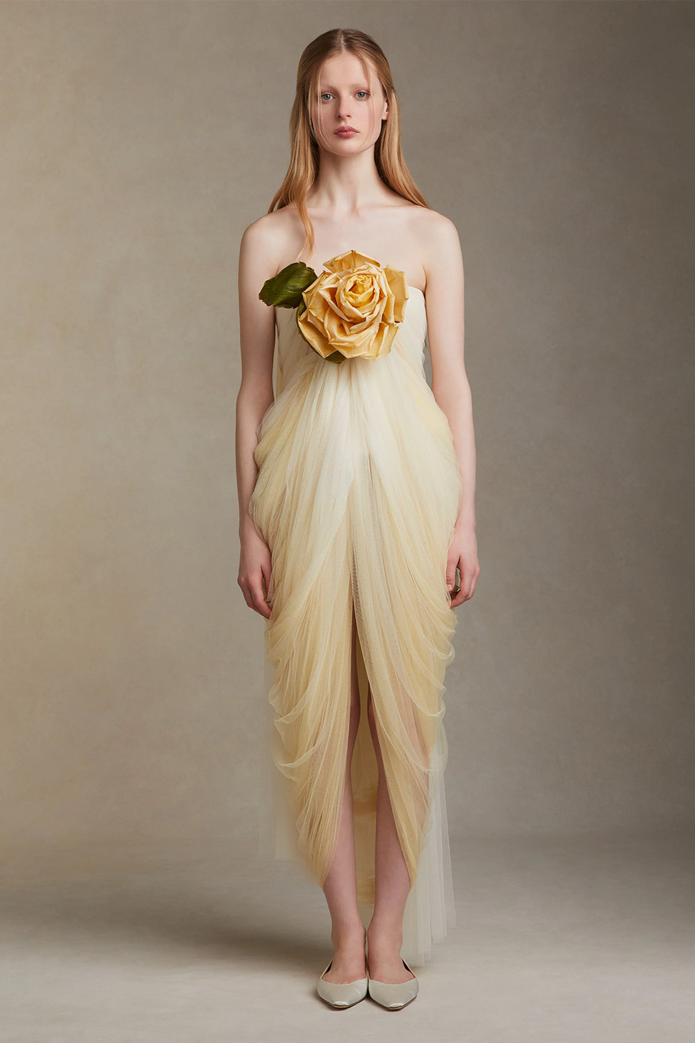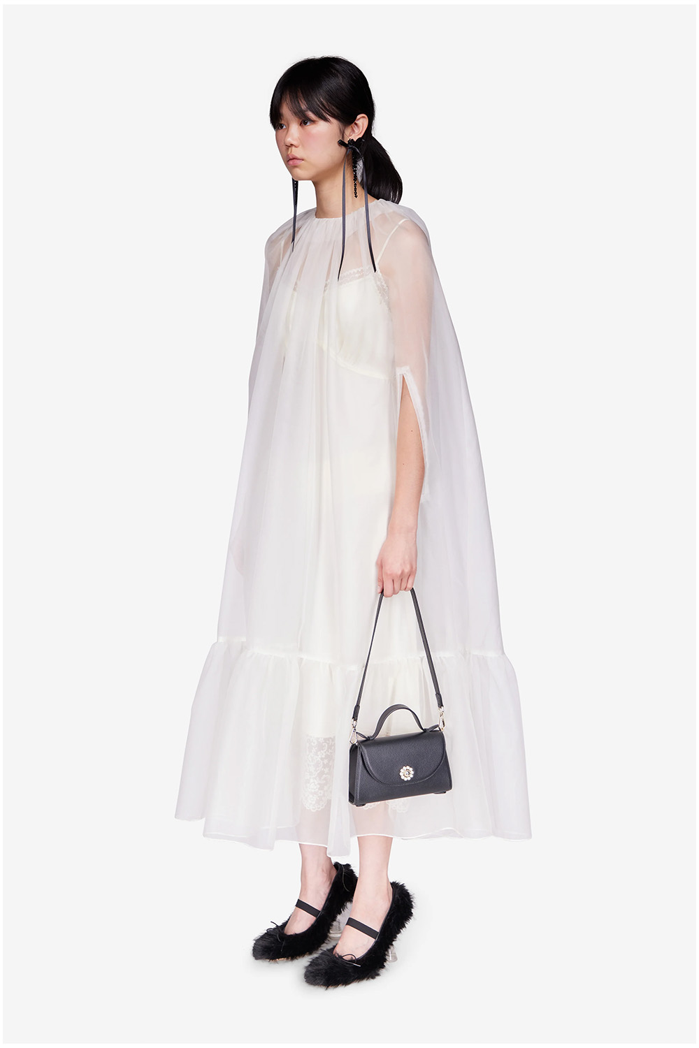 For the more is more bride, there are Simone Rocha‘s striking tulle gowns and pearl accessories. The Frill Cascade Cape Dress (Look 11 on the runway) is made from 100% silk organza and features a bold cape silhouette. The unlined design creates a semi-sheer effect, with pleated details at the neckline and arm slits on both sides for comfort.