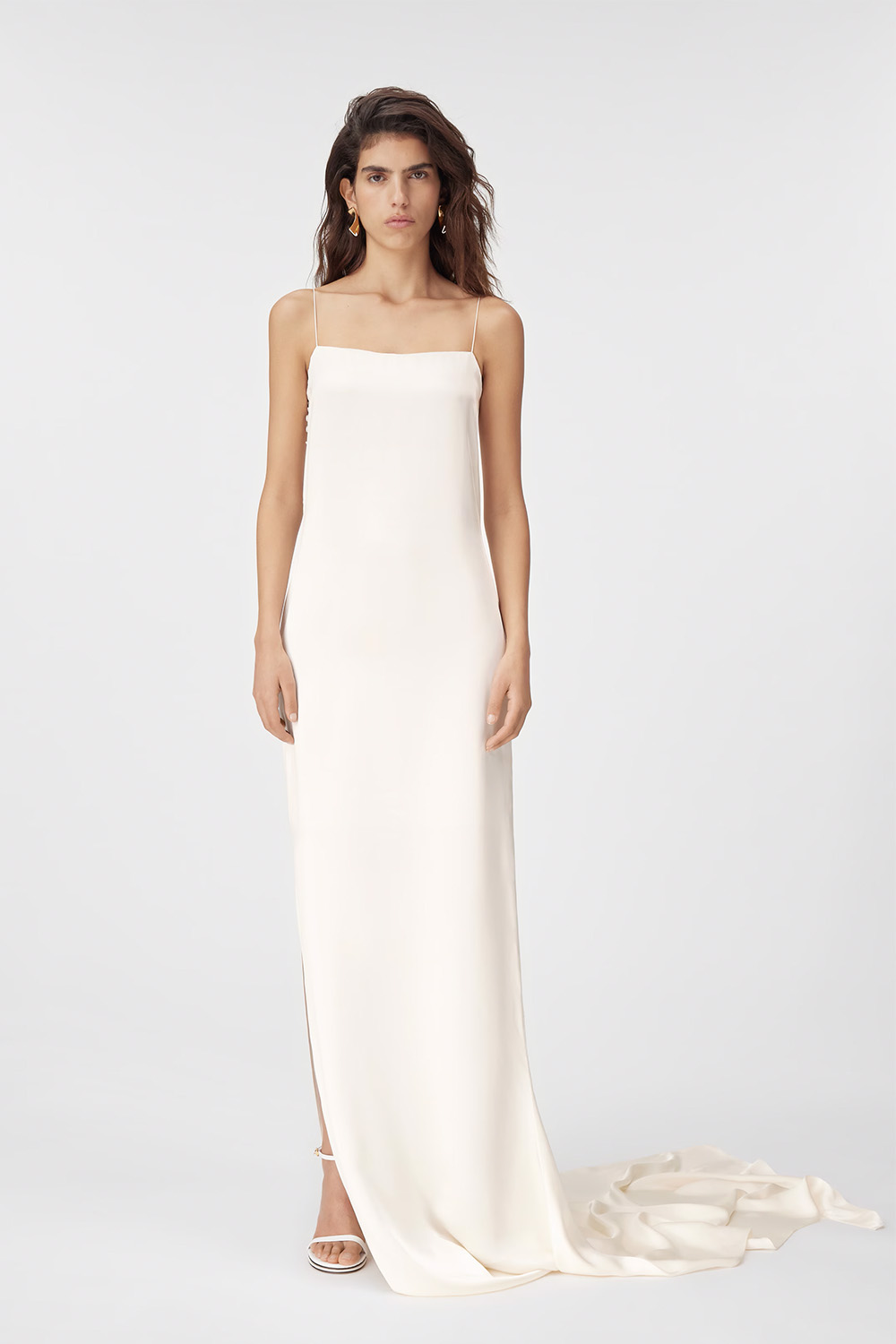 On the flip side, for the unfussy bride, Jacquemus‘s breezy, simple sheaths could be perfect. The Noiva Dress is made from 100% viscose, falling at a maxi length with thin straps, and lined in stretch muslin right up to the slit for comfort. The straight-cut gown features a side slit with a long asymmetric train—let the accessories shine or channel your inner Carolyn Bassett-Kennedy by going jewellery-free.