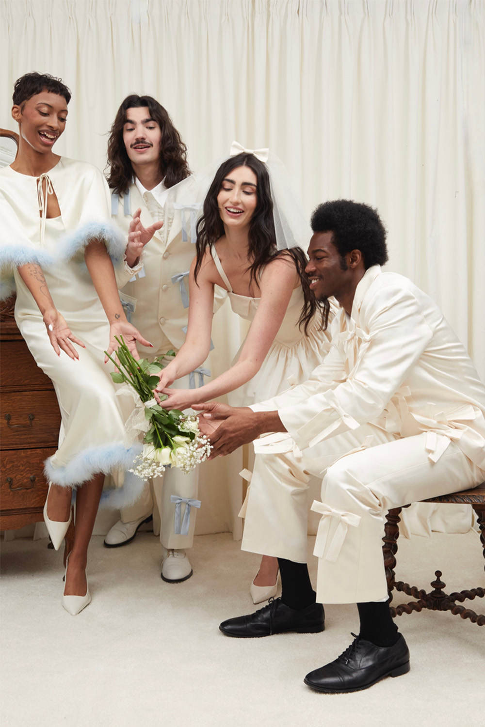 Of course, we can’t quite get Tanner Fletcher‘s bow-adorned suit out of our heads either. The brainchild of design duo Tanner Richie and Fletcher Kassel reaches for elements of romance and nostalgia to tell a story of modern youth and sentimental yearning—an excellent choice for couples who want to wear matching label’s on their big day.