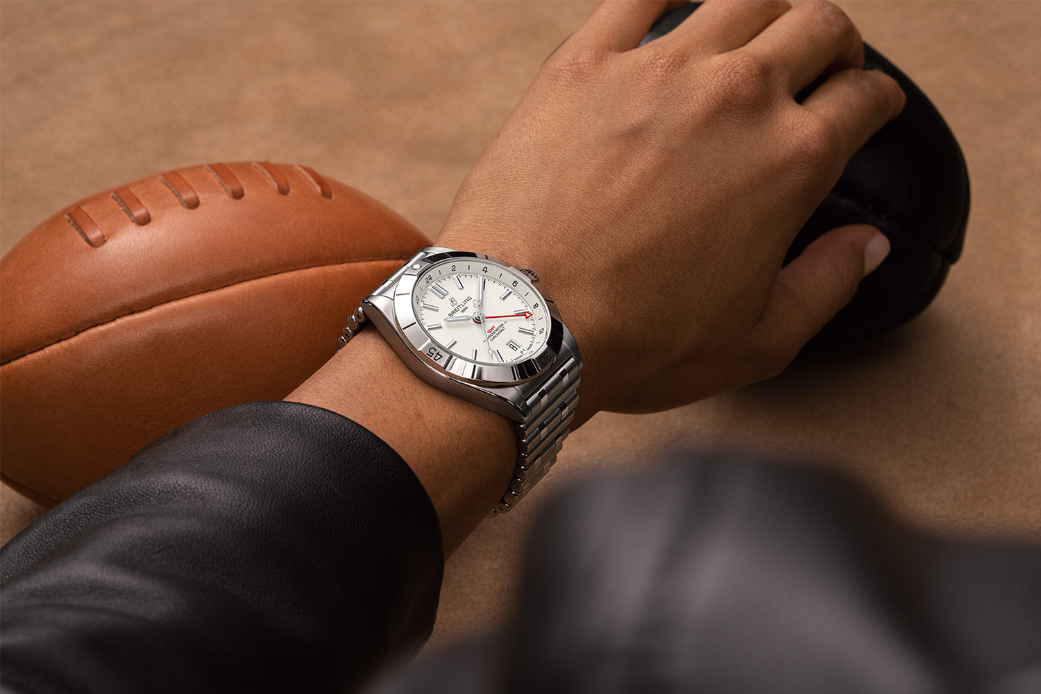 The new Chronomat Automatic GMT 40 swaps the Chronomat’s chronograph counters for a “GMT” movement that makes it easy to track multiple time zones at a glance. With a classic steel case and bracelet, a selection of dials in black, blue, green, anthracite, and white, and a bold pop of colour on its red GMT hand, the Chronomat Automatic GMT 40 is made to complement a wide range of looks and occasions. Inside the watch, a Chronometer-certified Breitling Caliber 32 automatic movement promises to provide reliability and accuracy wherever your journey takes you.