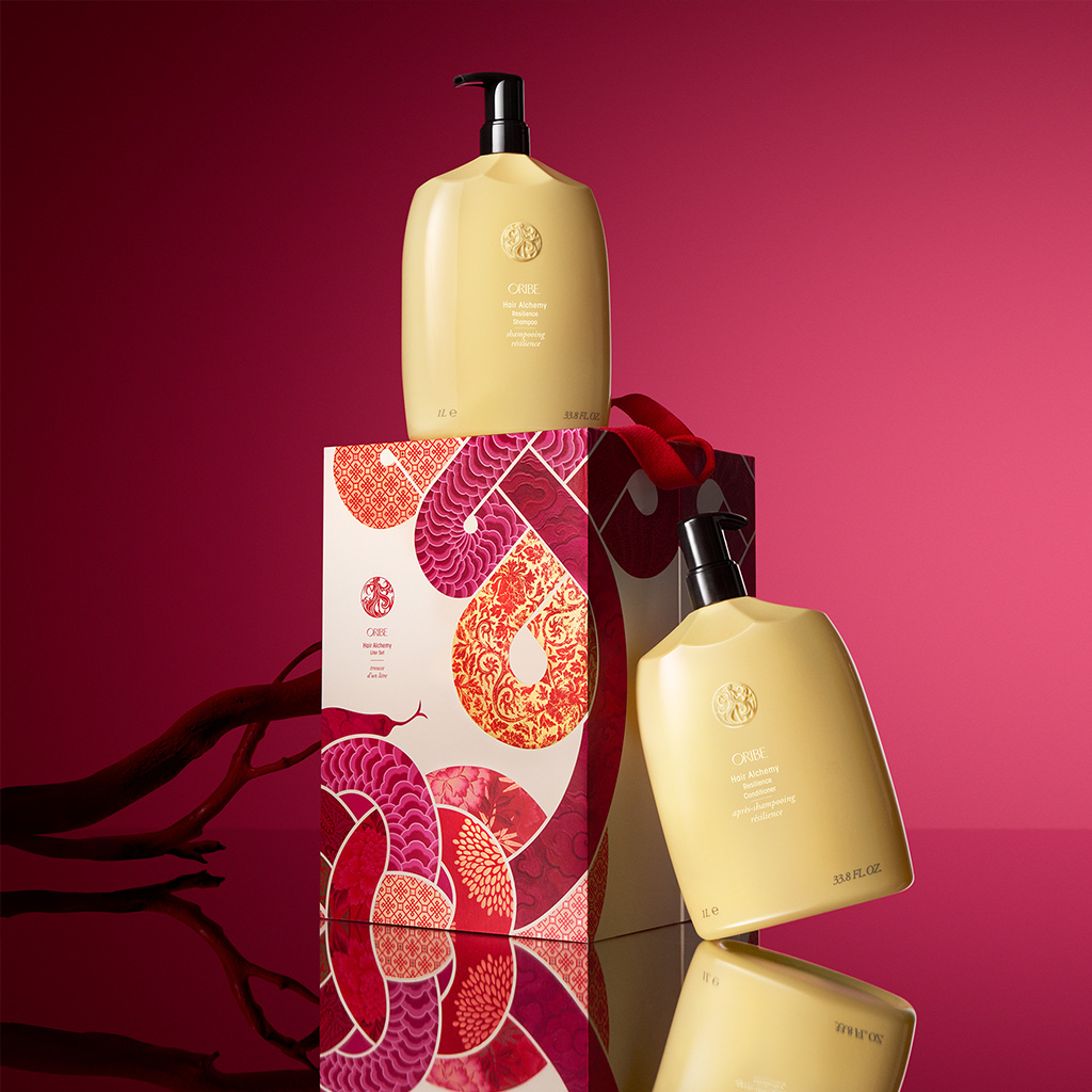 Celebrated artist and textile designer Chris Chun combines his heritage and signature style in Oribe’s two special-edition Lunar New Year gift sets. Inspired by the Mystic Knot, a traditional symbol of never-ending luck and prosperity, the gorgeous packaging features flourishes of deep red, flowers, and snakeskin textures.