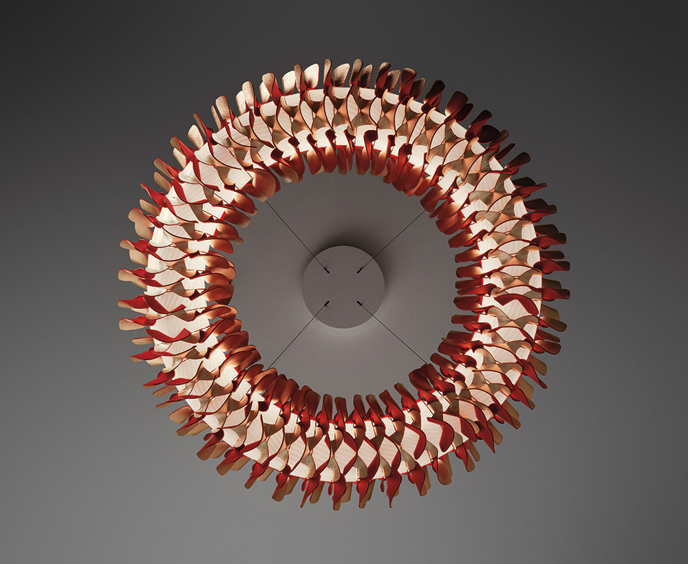 Case in point: flying atop the exhibition is a group of decorative mobiles designed in the shapes of South American Quetzal birds. Thirteen twisting feather-like strips are covered with pieces of Vuitton leather—blue on one side, green on the other, with their edges dyed red. The final feather, longer to give the mobile balance, is covered in red leather and recalls the birds’ vermilion breasts. Their magic is in their movement—tropical birds perpetually in flight.“ When you observe the Quetzal, you can feel like you’re in South America. It’s not the object travelling, it’s the object showing you a moment of travel,” says Aurel Aebi, who helms oï alongside Armand Louis and Patrick Reymond. The Quetzals are exhibited alongside origami leather bowls ingeniously made from a single cut of leather twisted and molded into a circular shape. Both are examples of what the oï team calls “storytecture”—transforming materials to tell stories in unique ways. In the case of working with leather, the oï team references the material’s inherent pliability as a root for organic experimentation. “People say form follows function, but we say it follows emotion,” says Aebi.