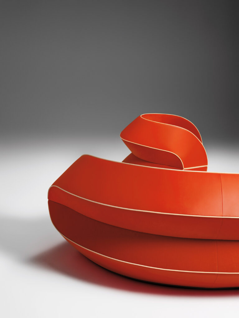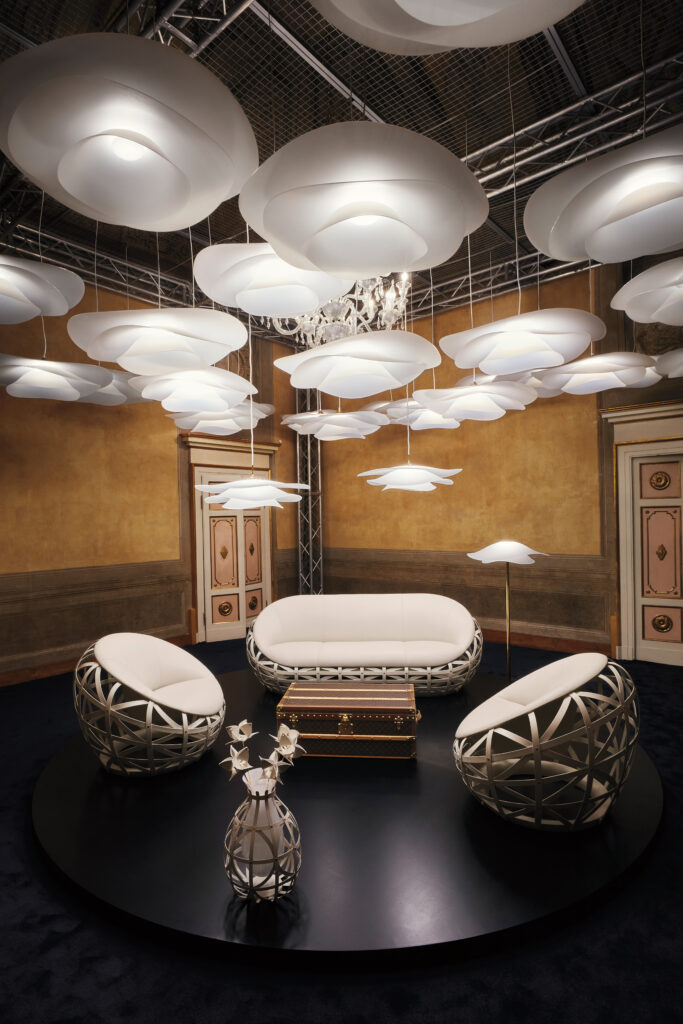 Up a spiral staircase, and displayed in contrast to the palazzo’s many-frescoed ceilings, is the latest exhibition of Vuitton’s Objet Nomades, a collection of modern furniture and homewares that has grown to 60 pieces since its inception in 2012. Objet is an ongoing collaboration between the luxury house and internationally-renowned designers including Marcel Wanders, Raw Edges, and Campana, who have been invited to create pieces inspired by the idea of bringing far-flung worlds home. Of this year’s 11 new additions, four are designed by Swiss design firm atelier oï, who explored the possibilities of working with Vuitton’s signature leather.