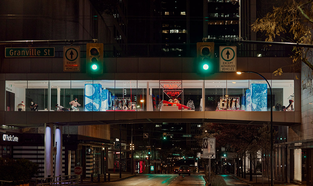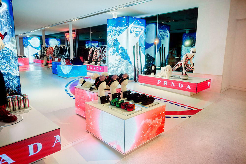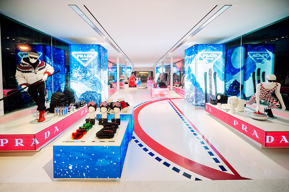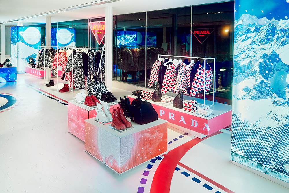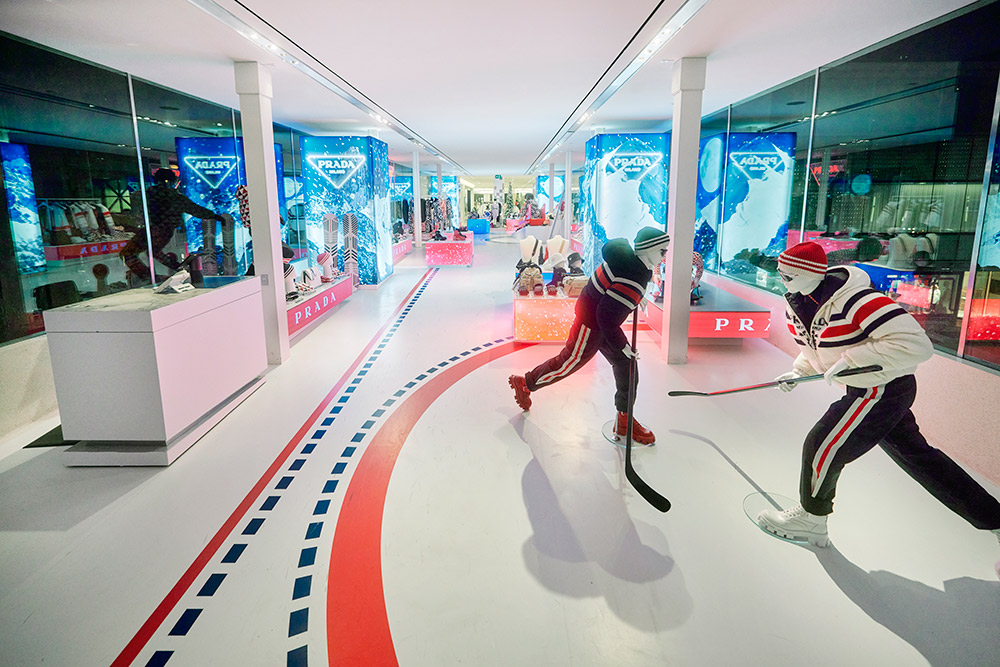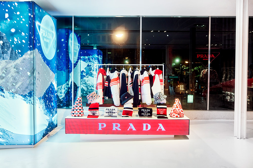 Glide into a sport-inspired winterscape with “Prada On Ice” at Vancouver’s Skybridge Holt Renfrew location from November 2nd to November 21st. This exclusive pop-up collection reimagines winter sports in the eyes and hands of Prada. The collection is set in motion with mannequins in athletic poses adorned in bold designs that fuse innovative materials with iconic styles. Vermillion red and cerulean blue lines cast shapes onto a stark, icy-white backdrop enabling shoppers to be mesmerized by a setting inspired by a hockey rink. Elevated garments and functional accessories combine the art of high-performance sport with Prada’s distinctive style in this unique retail experience. Whether it be a mountain-inspired fine cashmere sweater or a pair of reinvented ski goggles, “Prada On Ice” flaunts a deep appreciation for the world of winter sport.