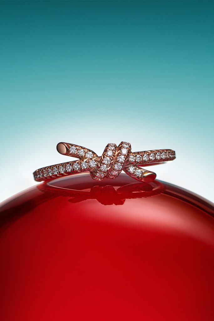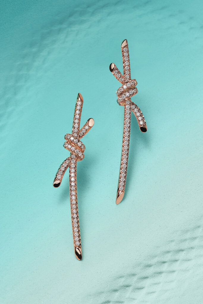 The Tiffany Knot is the tie that binds forever, with its signature bow design symbolizing togetherness. An ideal way to set the tone for a year filled with connection and love, the Knot wire bangle with a clean 18k rose gold band offers a bright splash of pavé diamonds along the knotted middle. Paired with the Knot drop earrings and matching ring—both encrusted with pavé diamonds set in 18k rose gold throughout—the striking contrasts and twisting shapes create an elegant set. The intertwined materials honor the many aspects that come together in love and good fortune, an unbreakable bond for the ages.