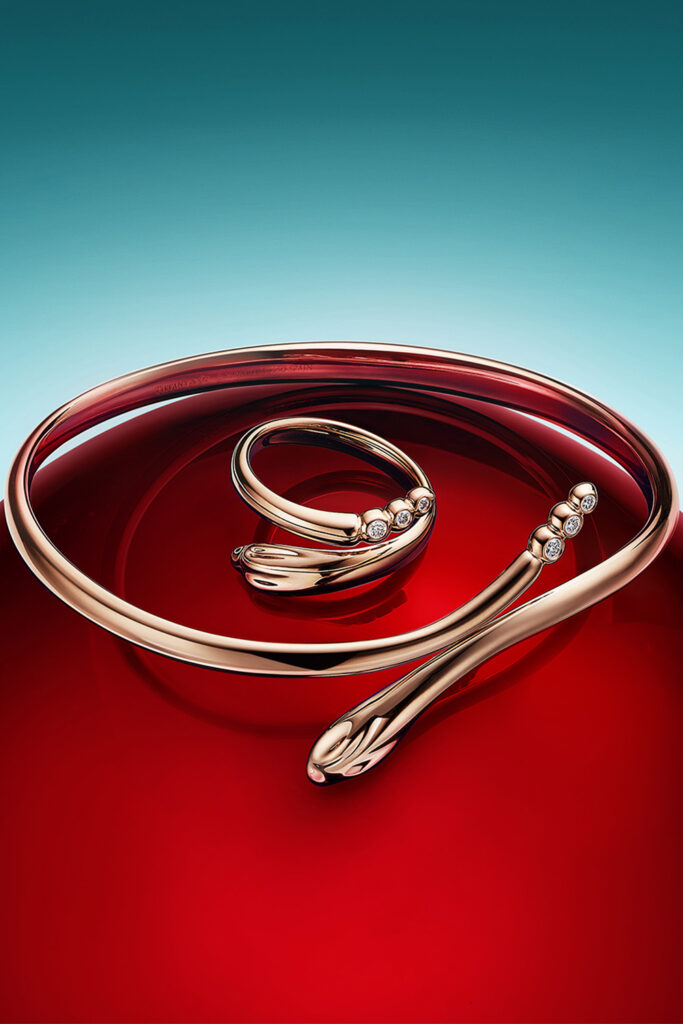 As we enter the Year of the Snake, it seems only right that Tiffany & Co. has expanded its Elsa Peretti Snake collection—especially as the company celebrates more than 50 years of her designs—with a bracelet and ring that evoke the animal. Peretti first designed her iconic snake motif pieces in 1985, mixing sophistication with a playful, imaginative design. The 18K rose gold Elsa Peretti snake bangle bracelet wraps around the wearer’s wrist like a snake climbing a branch, with the ring mimicking its shape. The snake emblem has long been seen as a symbol of transformation and resilience, and the diamonds encrusted along the flick of the snake’s tail create a sense of movement in the design.