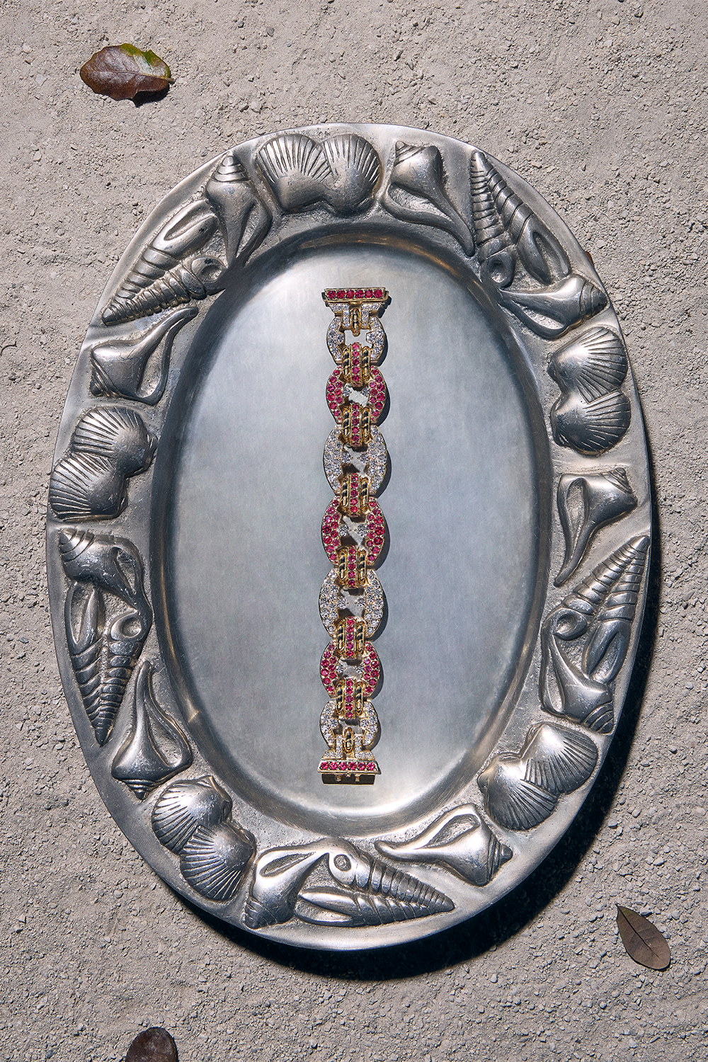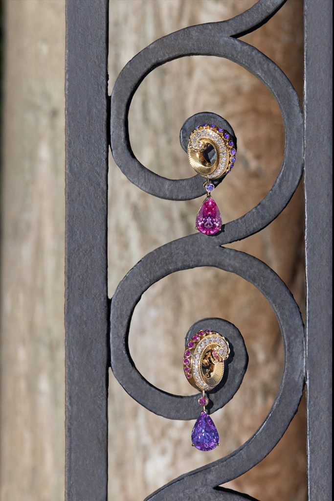 The Cap Vers Le Trésor—“sailing towards the treasure”—bracelet, made with yellow gold, rubies, and diamonds, mimics the chains on anchors dropped at shore, signifying the arrival at a destination. The Ondulations Marines earrings pay homage to the colourful life teeming below the waves—curled like a seashell, the 18K yellow gold is encrusted with diamonds. Each earring has a precious stone dangling from the spiral shell shape—one 5-carat mauve sapphire and one 4.55-carat pink sapphire—to create a dynamic mixed visual.