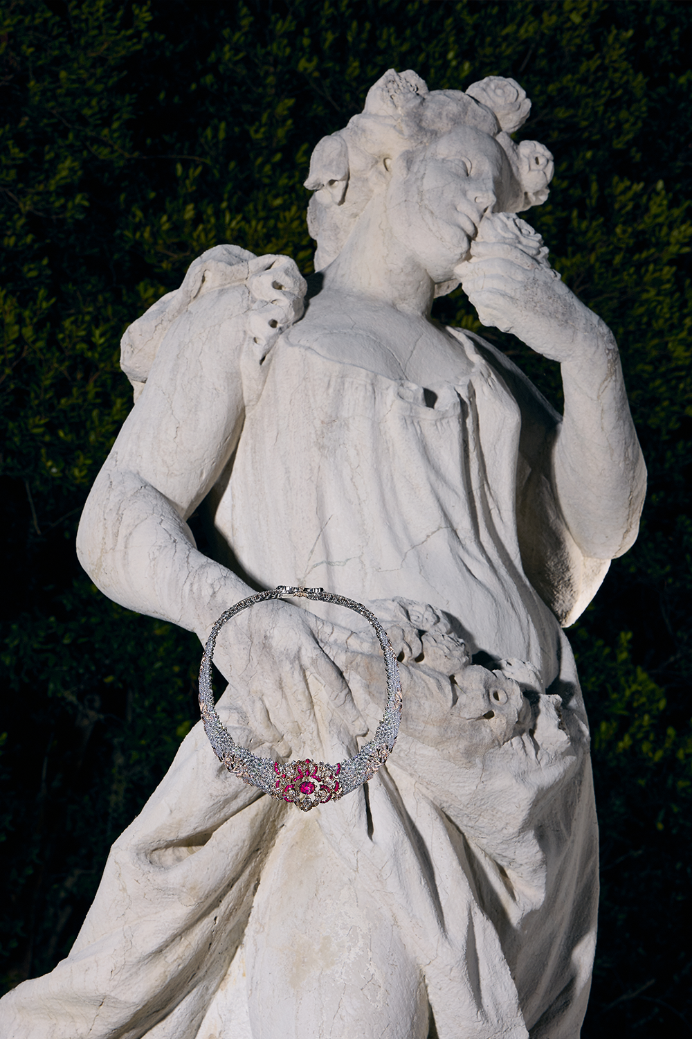 Coral reefs are the heart of colourful undersea life—these brightly hued animals provide life essentials for many other vibrant creatures, making it no surprise that Van Cleef & Arpels pulled inspiration for its show-stopping necklace. The Récif Corallien necklace, with a mix of white and yellow gold thoroughly encrusted with diamonds and rubies, boasts an oval-cut ruby of 5.33 carats and a round DVVS1 1.01-carat diamond with pristine clarity.