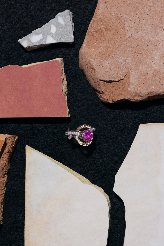 The hardware and materials of a mariner are reimagined as precious items. A good sailor has to know their knots—a motif that Van Cleef & Arpels has long been fascinated with. In 1947, the maison released rope-inspired ring mounts, playing with the appearance of knots and movements. The Amure De Saphir Rose ring—with white gold, rose gold, diamonds, and an oval-cut pink sapphire of 4.52 carats—elevates and enhances the rope motif.