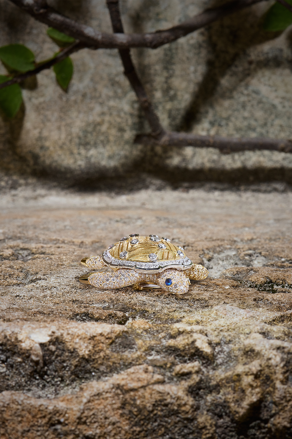 From the sand to the sea, tortoises can be seen along tropical coasts—their playful imagery inspired the Tortue de Cocos clip, with a radiant yellow-gold shell and sparkling diamonds, which play with the light.