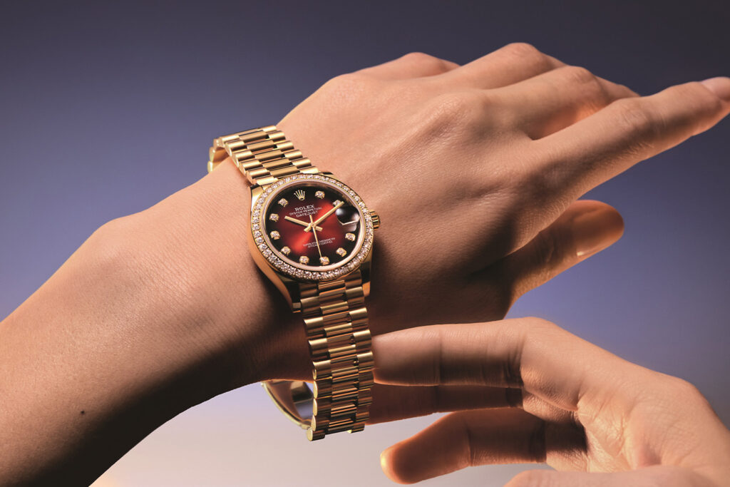 design, expert craftsmanship, and being in the right place at the right time, but what keeps them among the most coveted luxury items in the world comes down to one thing: consistency. Brands may tinker with their most iconic styles around the margins, but just as you wouldn’t put sunglasses on the Mona Lisa, the essential form must always remain the same. Such is the case with the new 18K yellow gold Rolex Datejust 31. Bedecked with 46 brilliant-cut diamonds around its bezel and augmented with a mesmerizing new red ombré dial, it remains gloriously unmistakable as a member of one of the luxury world’s most prestigious families.