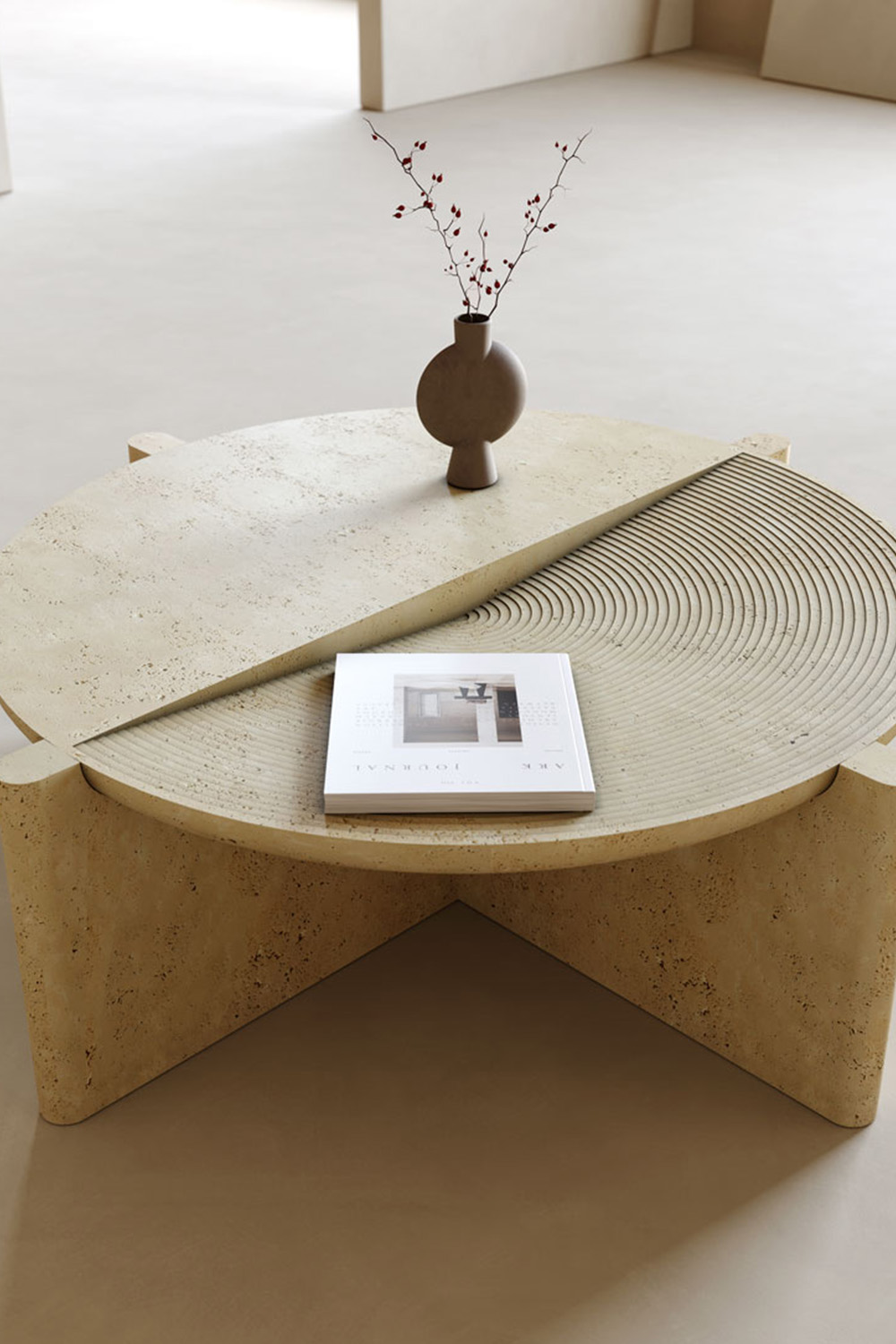 Studio Kali founder Fulden Topaloğlu, who grew up on the Aegean coast, says that the Arkhe coffee tables are a tribute to the ancient amphitheatres found across the Mediterranean. The tables are carved from blocks of travertine, which give them a feeling of historicity—as though they were excavated from some archeological site bordering the Mediterranean Sea. The Arkhe tables come in four variations that each feature a tabletop with a distinct combination of a ridged, inclined surface and a flat one. Because of its method of construction, each table is unique, carrying slight imperfections that give it a personality and make it a true work of art.