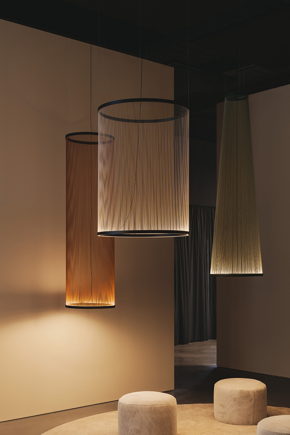 This collection of conical and cylindrical pendant lamps is an exercise in extreme delicacy. Created by London-based architect, sculptor, and designer Umut Yamac, the Array collection is a series of lightweight hanging fixtures featuring threads pulled taut between two aluminum rings. The threads are spaced in such a way as to create both transparency and volume, while the light is projected downward from an invisible source located in the lower ring. Array is available in different sizes and dimensions for customization, and in intimate shades of beige, green, and red.