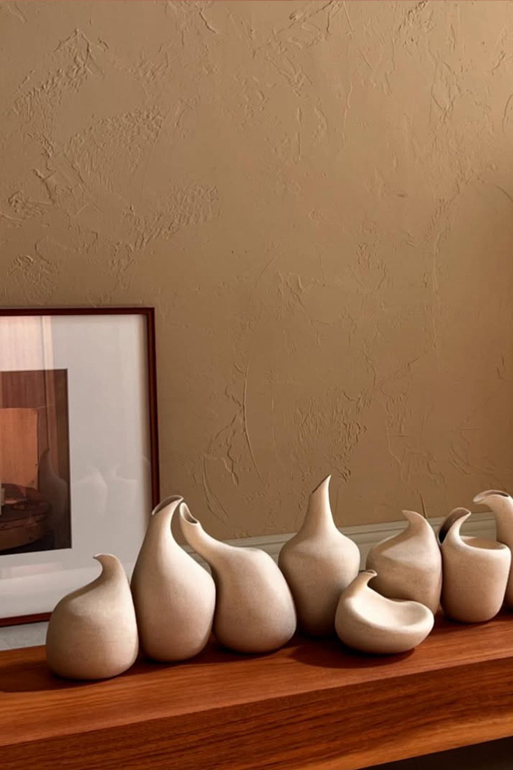 Hong Kong-based ceramics artist Kwan Wai Chan’s collections under her studio éphēlis often project an intimate simplicity that makes them resonate emotionally with viewers. Her Dialogue series is no exception. The collection of vase-like ceramics with beautifully fluid forms suggests conversation and relationality: each piece is individual, but they fit together in surprising ways. Each ceramic’s form appears complete and self-sufficient, but when placed next to another Dialogue ceramic, the objects’ delicate wisps and indentations suddenly enter into conversation. The subtle designs of the ceramics are recontextualized through their relationship with the things around them.