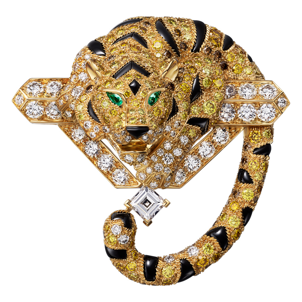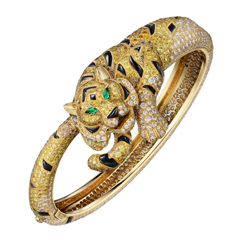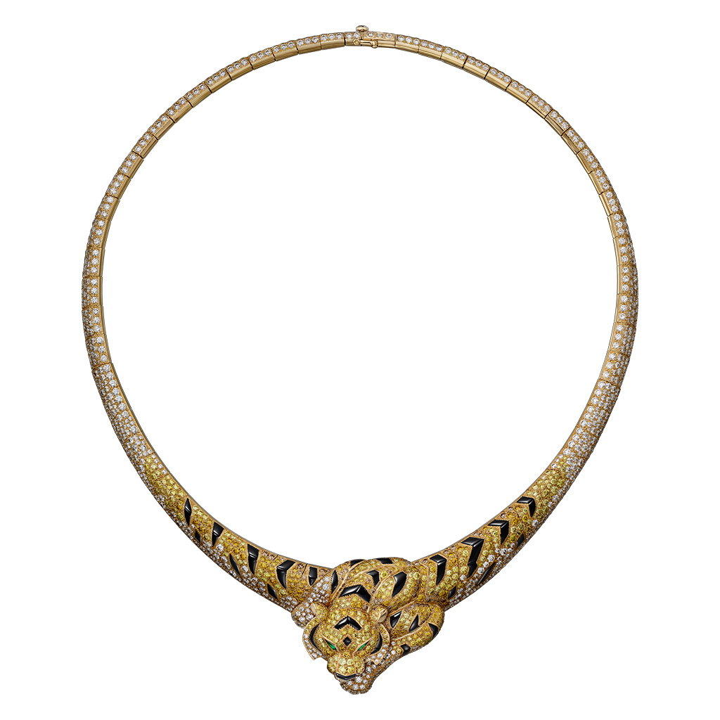 A tiger’s determined gaze is reimaged with piercing emerald eyes, and its powerful stance imitates reality as it stretches across the neck collar. Together, these spirits come alive in tangible ways, with emotive qualities seen in the animal kingdom transformed into jewels.