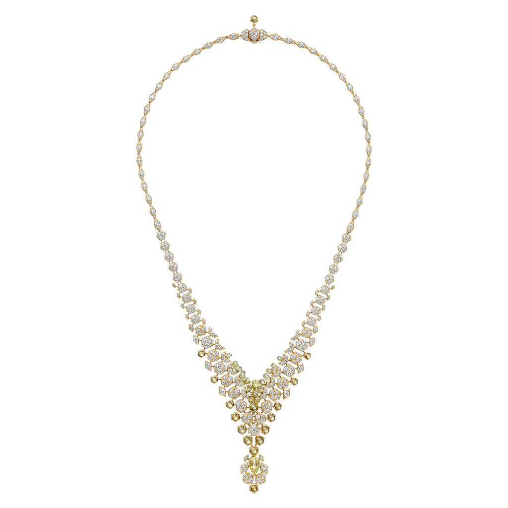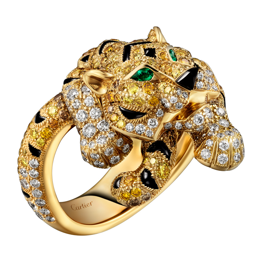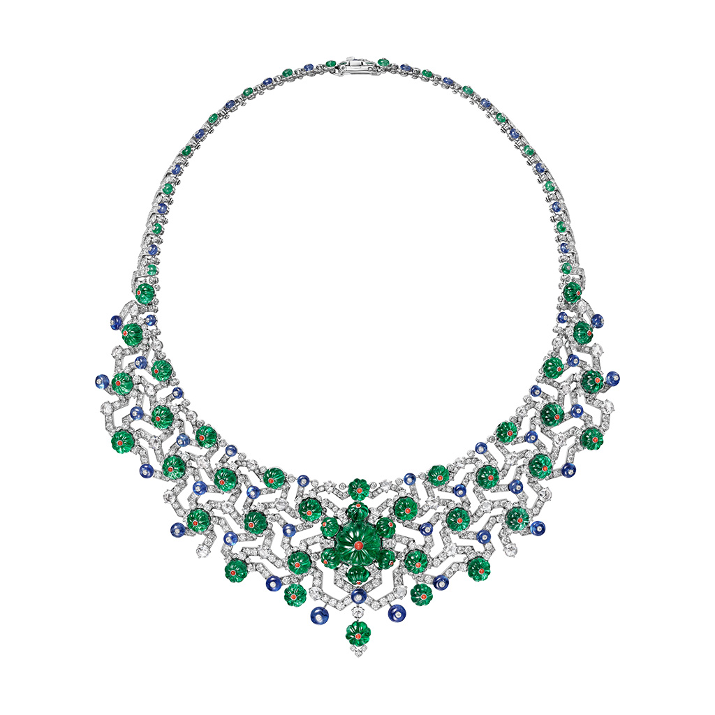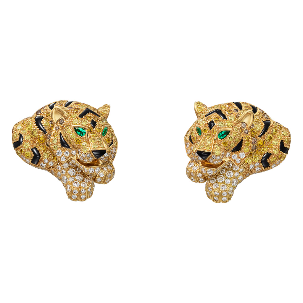 A tiger’s determined gaze is reimaged with piercing emerald eyes, and its powerful stance imitates reality as it stretches across the neck collar. Together, these spirits come alive in tangible ways, with emotive qualities seen in the animal kingdom transformed into jewels.